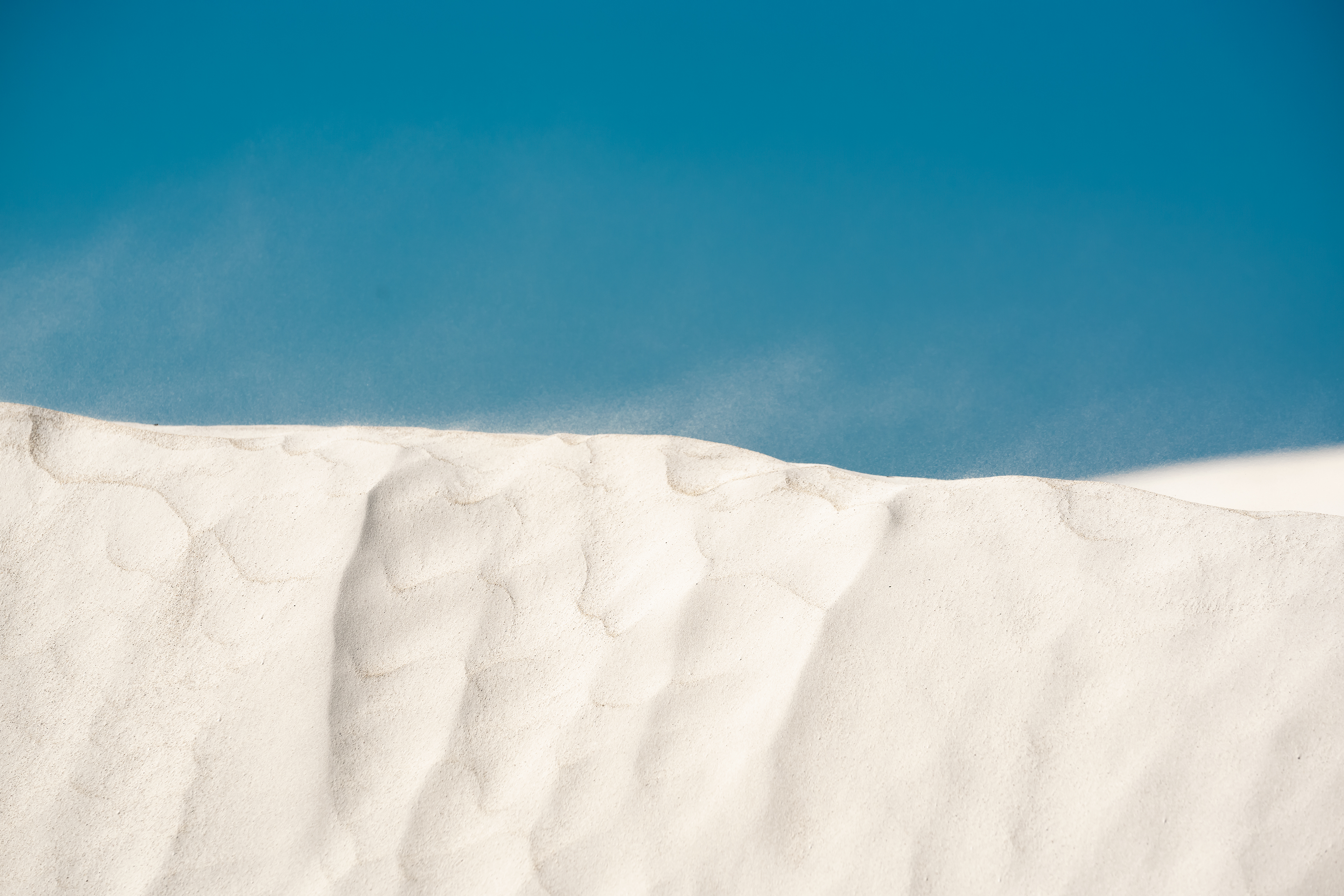 パースからセルバンテス(Cervantes)へ向かってドライブ中、白い丘のようなものが見え隠れし始めた。「え、砂丘? こんなのの知らないぞ」と思い車を止めてみた。道路脇の案内板に書かれていた名称は「Mobile Dune」灌木の野原の中にいきなり現れた鯨のような姿。舞う砂と風紋。これが真っ白で美しかった。